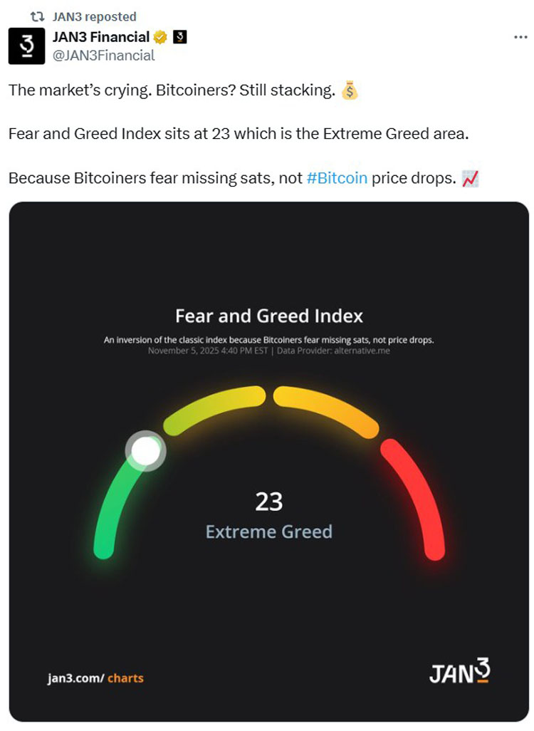 “市场在哭。比特币?还在堆叠。恐惧和贪婪指数位于23,这是极端贪婪的区域。因为比特币用户担心错过sat,而不是比特币价格下跌,“该公司周三表示。