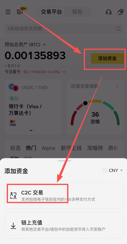 1、进入币安APP( )之后,买币也就是我们俗称的入金。我们点击这里的【添加资金】,选择【C2C交易】。