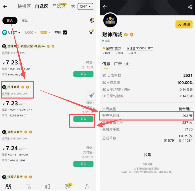 6、下面这些就是符合条件的商家了,我们就可以去选择一个商家去跟他交易。选择商家首先我们要看他的成单量和成交率都是越高越好。然后点开他的主页,查看一下他的账户已创建时间,越久越好,至少要是半年以上的。因为他的账户存活的时间越久就证明他的资产越安全,交易了这么长时间以来,没有出现过什么问题。确认跟他交易之后我们点击【买入】。