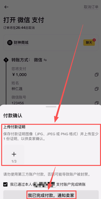 8、这个时候我们的订单就生成了,我们可以在“聊天”这里看一下卖家还有那些具体的要求,比如说不可以发送敏感词汇。确认没有问题之后,我们就可以打开微信,根据商家提供的二维码去微信添加他的好友,然后给他发红包,付款时截图留证。然后我们回到币安,点击【上传付款证明】。