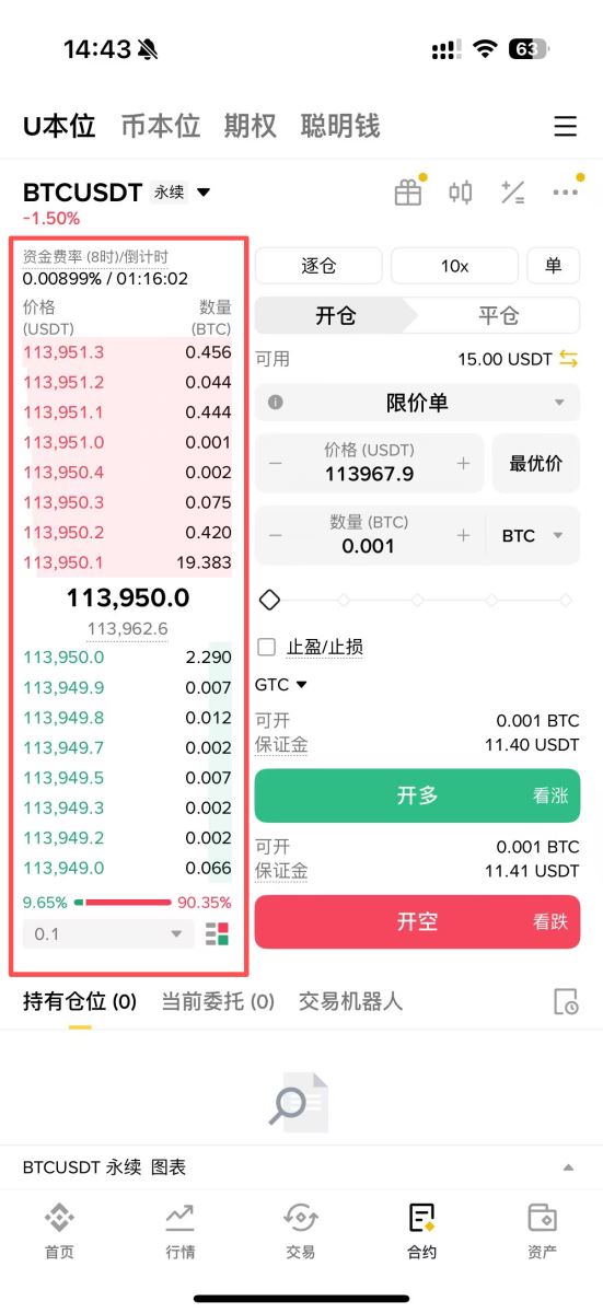 当我们市价买入的时候,我们需要依据卖方的订单簿上的最新价格进行订单匹配,且市价会稍微有滑价产生,因此开仓时BTC 价格为113,950,但我们的持仓均价却在113,943。